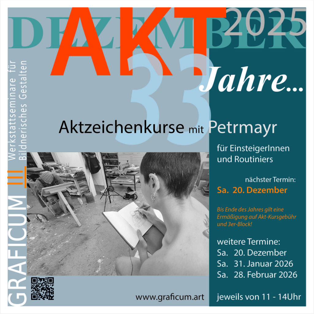 Teilnehmerzahl: 4 – 6 TN Anmeldung ab sofort! Kursbeschreibung: Der Workshop „WEG VOM ZIEL“ konzentriert sich auf kreatives und freies Experimentieren im Bereich künstlerischer Gestaltung auf der Fläche (Leinwand;Papier etc..) Das Programm beinhaltet u.a. fakultativ verschiedene Prozesse wie manuelle Drucktechniken (Radierung, Holzschnitt, Siebdruck, Cyanographie etc…) Auch Aktzeichnen (im Programm enthalten). Der WS bietet Gelegenheit neue Techniken zu erkunden und individuelle künstlerische Fähigkeiten zu erweitern. Zuerst wird ein Sujet erarbeitet das jede:r auf seine Weise in Bildideen umsetzen kann. Der Schwerpunkt des WS liegt im Experiment, der Freude am Gestalten im Austausch mit anderen. Zeit und Umfang des Seminars entsprechen in etwa einem Semester und beinhaltet insgesamt 32 Stunden, aufgeteilt in 8 Module à 4Std, wobei die jeweiligen Termine mit den TN:Innen nach Anlauf des Seminars abgesprochen werden. Eine digitale Anmeldung ist erforderlich. https://www.graficum.art/anmeldeformular/