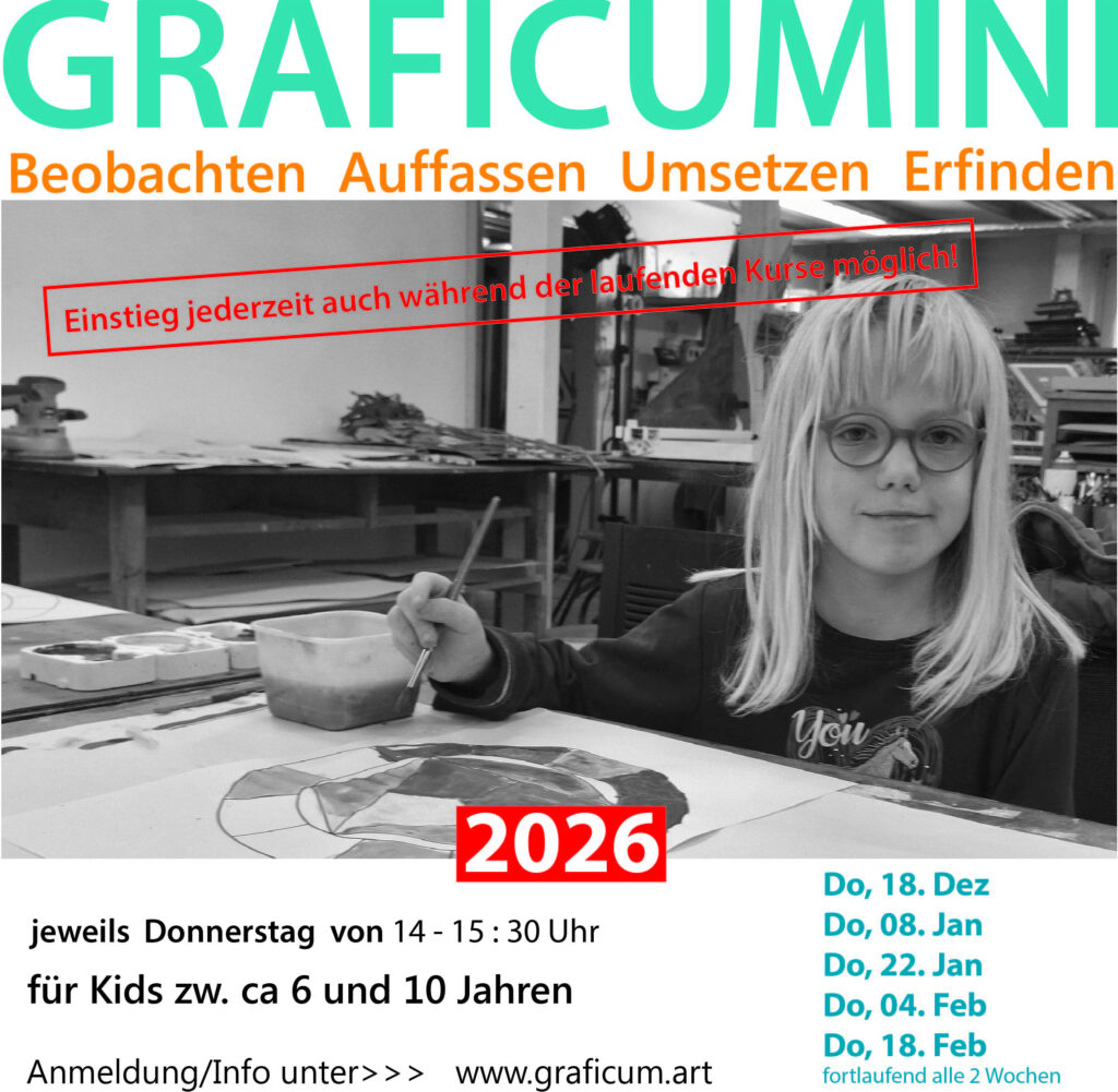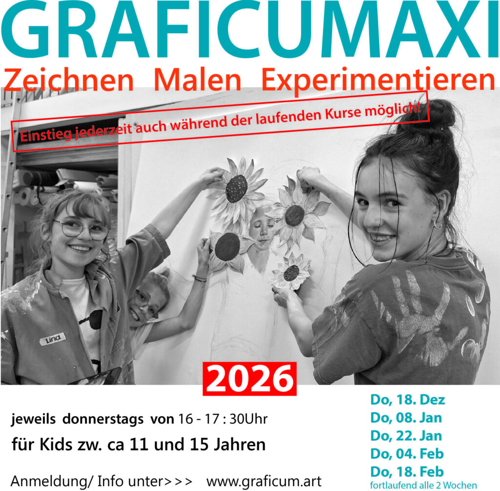 Anmeldeschluss: 1 Woche vor Kursbeginn Eine digitale Anmeldung ist erforderlich. https://www.graficum.art/anmeldeformular/